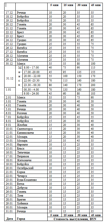 | Дата | 17.12, 18.12, 19.12, 20.12, 21.12, 22.12, 23.12, 24.12, 25.12, 26.12, 27.12, 28.12, 29.12, 30.12, 31.12: 8.00 – 17.00, 31.12: 17.00 – 20.00, 31.12: 20.00 – 22.00, 31.12: 22.00 -23.30, 31.12: 23.30 – 00.30, 1.01: 00.30 – 4.00, 1.01: 9.00 – 24.00, 2.01, 3.01, 4.01, 5.01, 6.01, 7.01, 8.01, 9.01, 10.01, 11.01, 12.01, 13.01, 14.01, 15.01, 16.01, 17.01, 18.01, 19.01, 20.01, 21.01, 22.01, 23.01, 24.01, 25.01, 26.01, 27.01, 28.01, 29.01, 30.01, 31.01 |